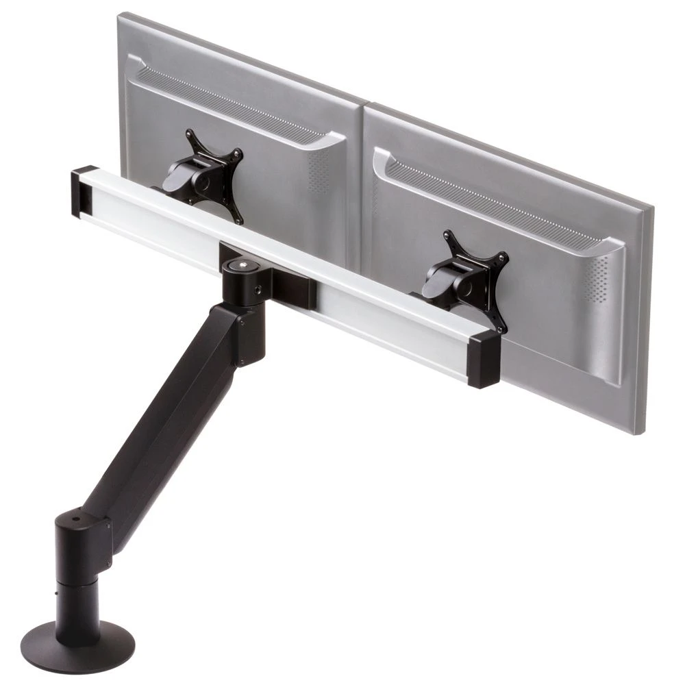 The CMD2018 combines the benefits of the compact SAA2018 monitor arm with the versatility of the CONNECT mounting beam to create an easily maneuverable, space saving solution for mounting two LCDs. Each monitor tilts, swivels and rotates individually on its tilter head mount. These can be placed anywhere along the 30” beam and can accommodate monitors up to 28.5” in width.