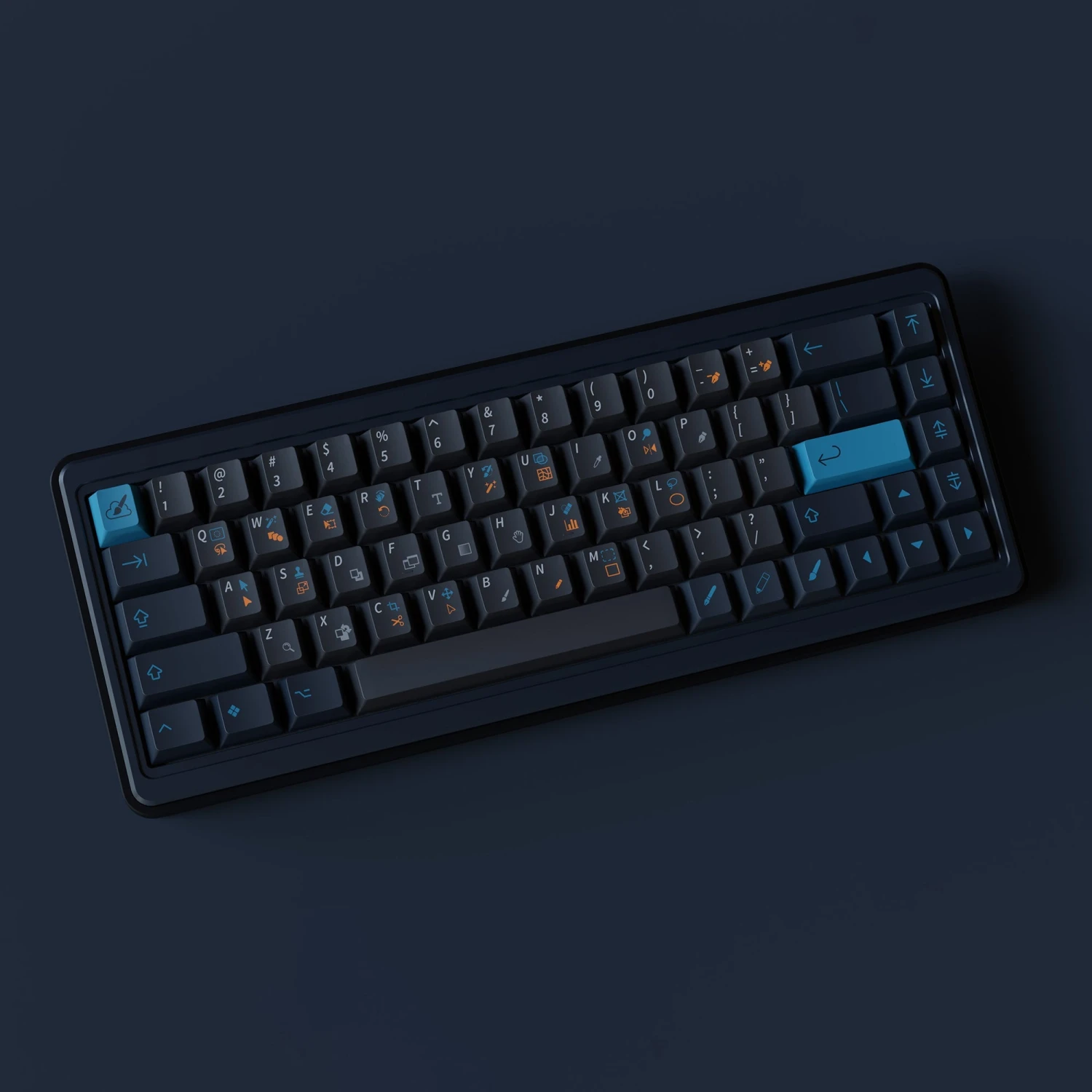 Introducing ePBT Creative Studio, a keycap set inspired by and featuring sublegends for your favorite creative tools. The set comprises dark gray alpha keys and two themed modifiers sets: a sky-blue and navy PS theme, and an orange and maroon AI theme. ISO-UK is supported in the base alphas kit, and NorDe support is provided via an extension kit.
