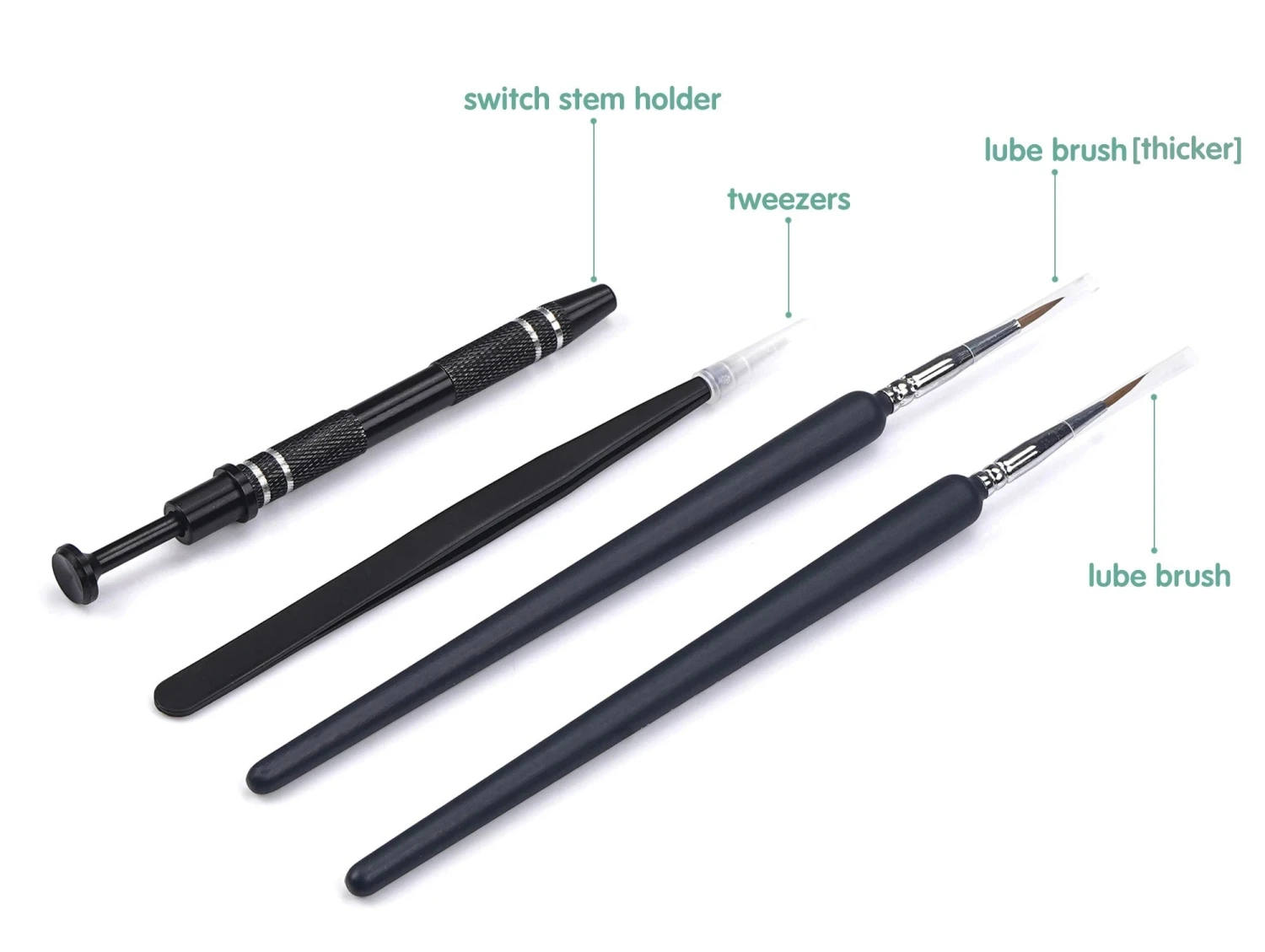 All the tools you will require for lubricating your switches. Perfect for those starting the custom keyboard hobby.