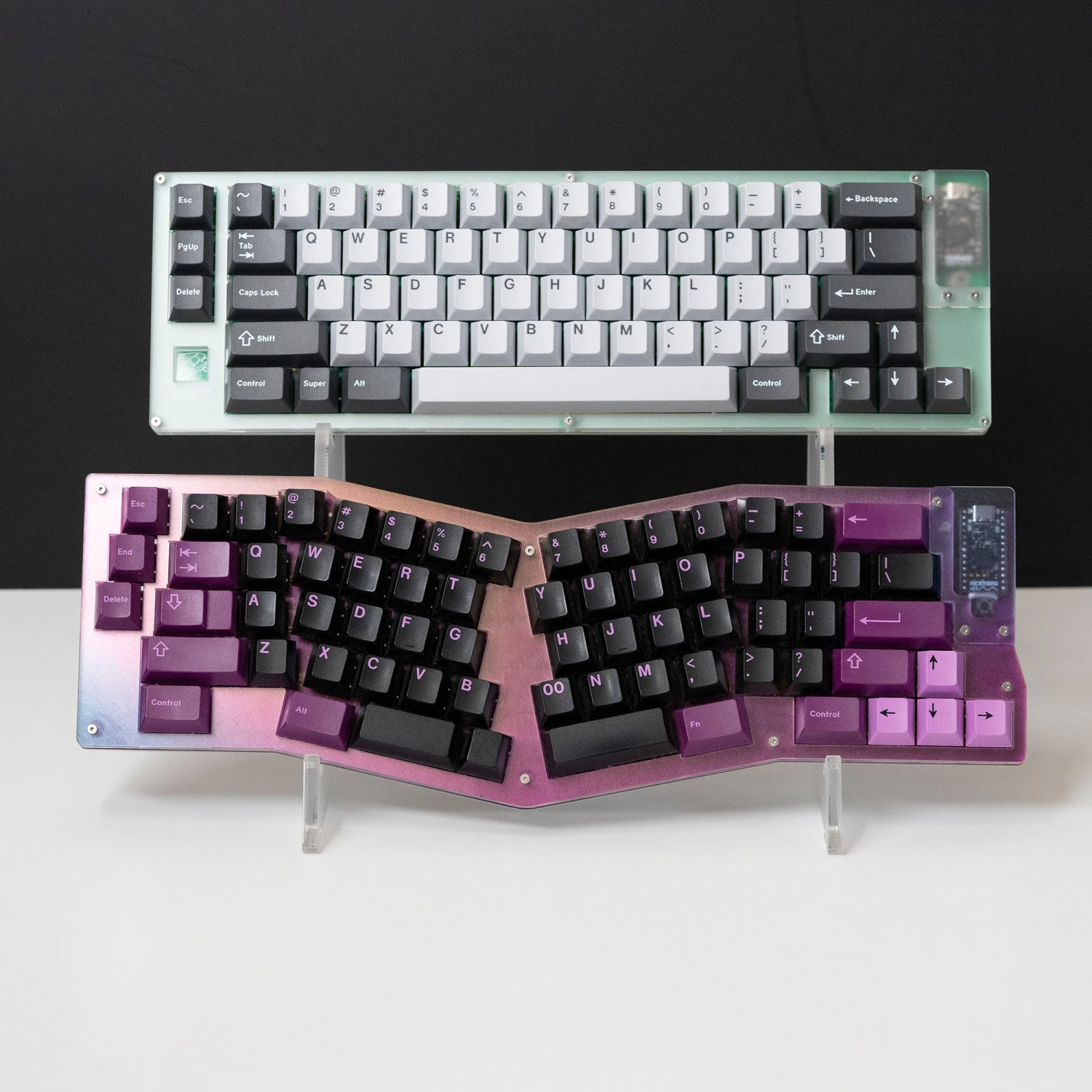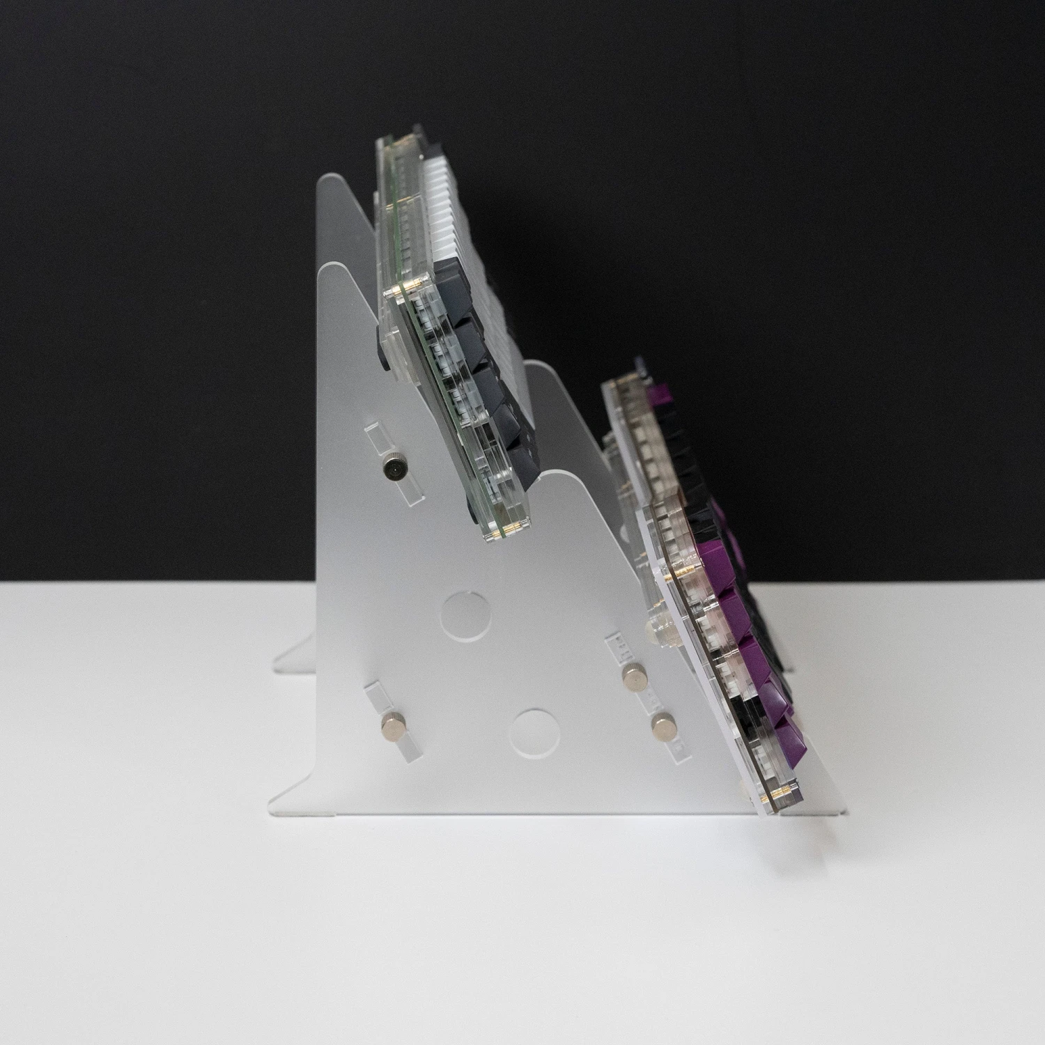 They are designed to display both boards fully – without the front board obscuring the one behind. Larger or taller boards will unfortunately cover the rear one but anything up to TKL should be fine.