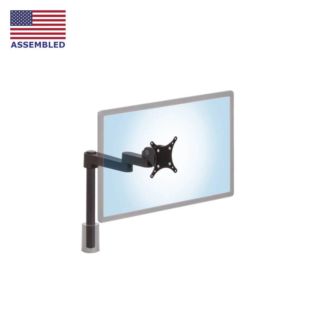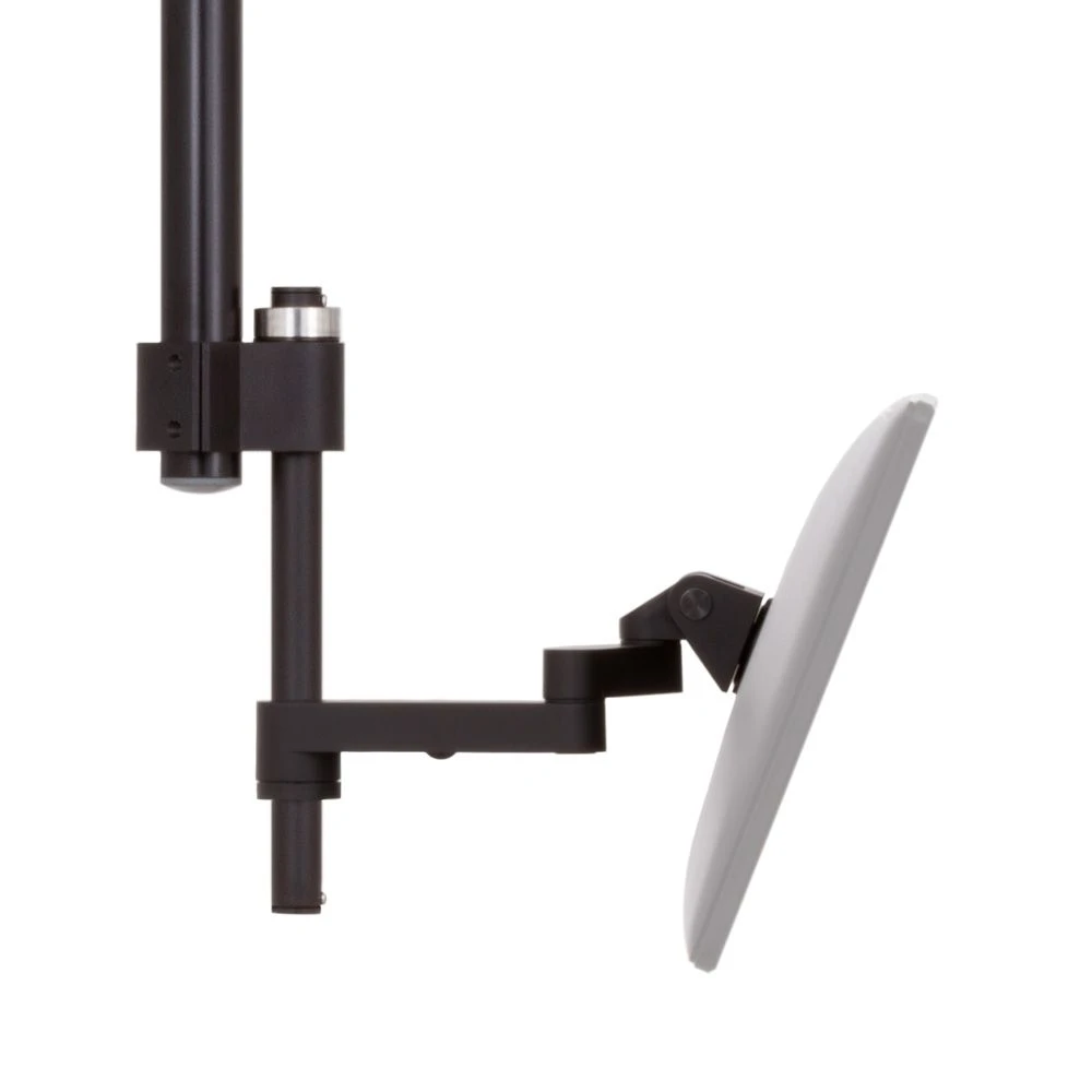 The LS9137S single monitor stand positions a flat screen monitor or VESA compliant device weighing as much as 35 lb. It provides generous tilt and pan as well as portrait/landscape rotation. It comes with a 14” pole but several optional lengths are available. Height can be easily reset for different users by removing the monitor and adjusting the arm assembly to the desired height.