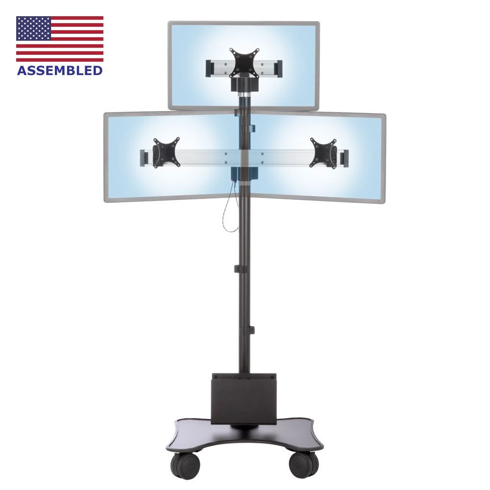This mobile triple monitor cart features a compact design, placing one monitor over two to minimize its width while still providing plenty of display space. The heavy-duty, sturdy cart facilitates easy movement even with substantial weight attached. Its perfect for store and lobby informational displays, education environments and medical facilities such as operating rooms and other patient care environment monitoring.