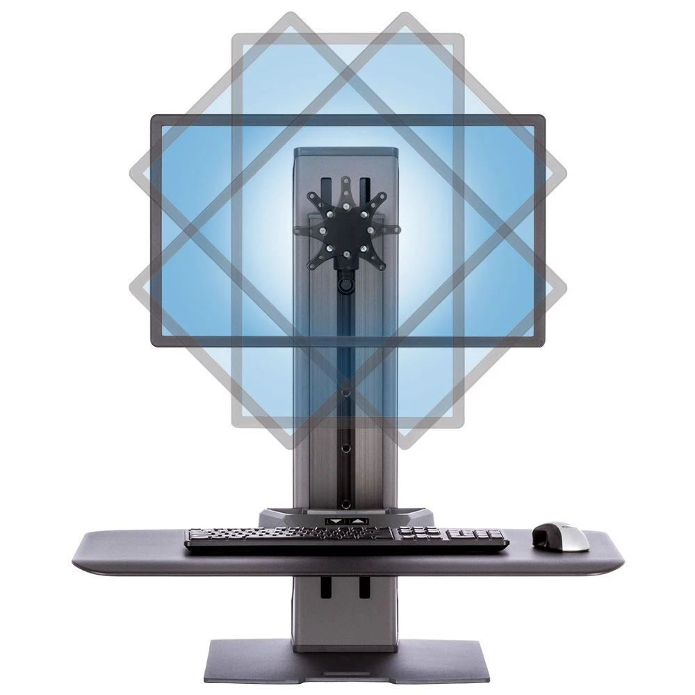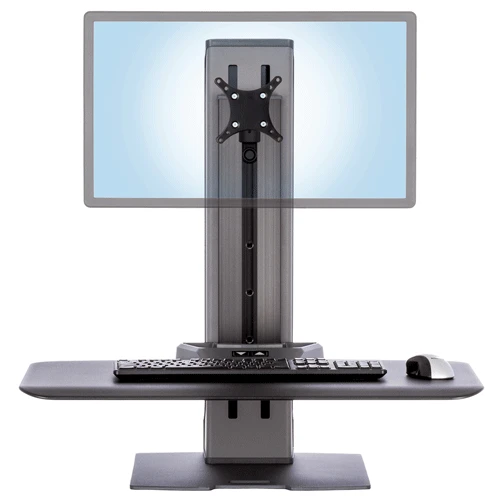 The Winston-E single monitor workstation is the ideal solution for any user who wants the ergonomic benefits of a sit-to-stand workstation without replacing any existing equipment. The workstation sits on a wide platform that keeps the device stable while in use. The height is adjusted with the touch of a button located at the front of the Utility Tray. The work platform and monitor together have a 18″ height range. A preferred standing height can be saved to the device, allowing the user to return the workstation to the stored height with a single button press.
