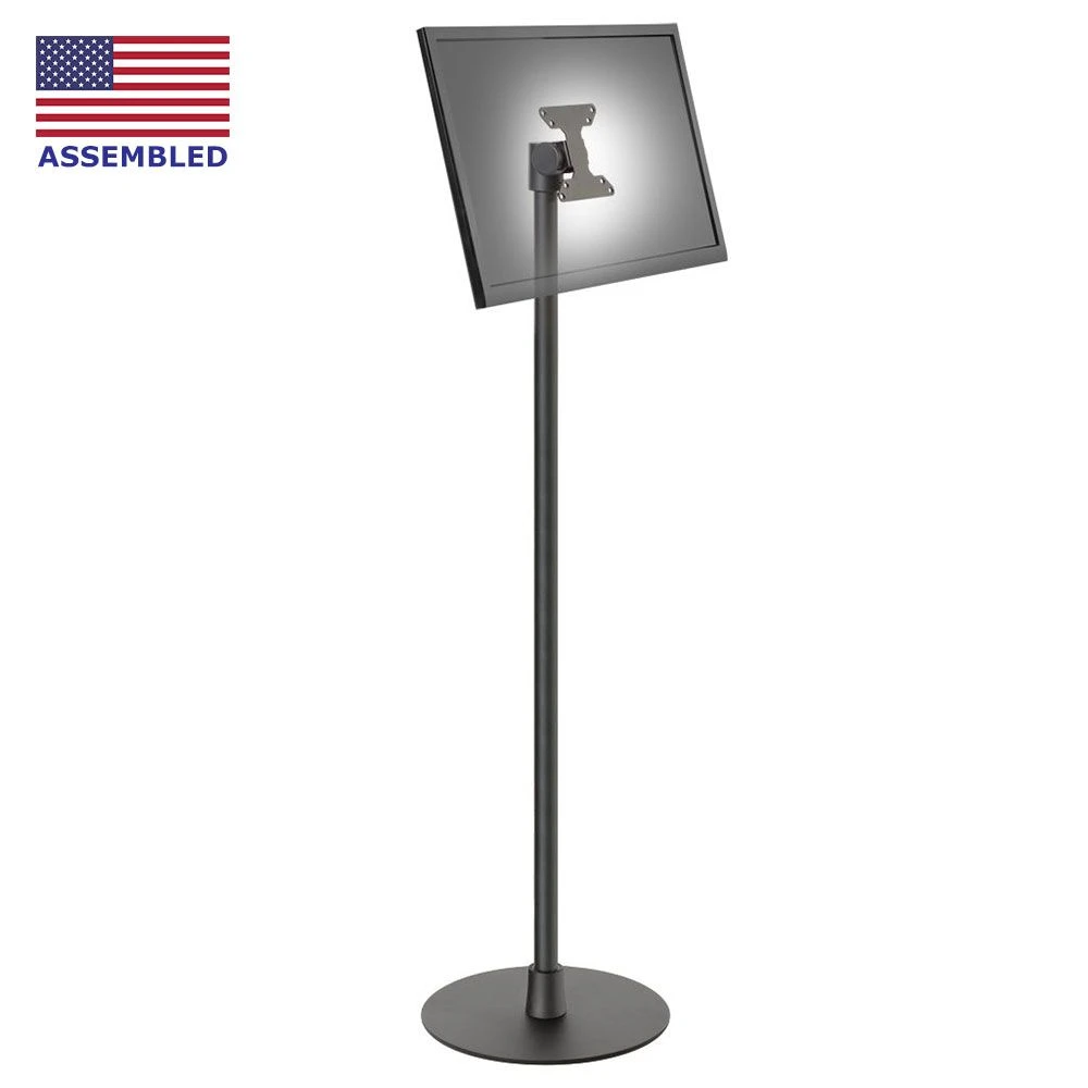 Ergomart’s Monitor and Tablet Floor Stand stands 42” in height and supports monitors, tablets and other attached devices up to 10 lb. For tablet enclosures or monitors that have a standard 75 x 75mm or 100 x 100mm VESA hole pattern, the device can attach directly to the mount. Some iPads can utilize Ergomart’s IPA-3 Secure iPad Holder to attach to the VESA plate. The sturdy 12” diameter base keeps the free standing floor mount stable. The attached monitor or tablet benefits from 100° of upwards and downward tilt, allowing the user to adjust for optimal viewing. A cable clip located on the pole keeps wires close to the device down the length of the pole, reducing visual clutter. This versatile mount is ideal for many applications, including point of sale, digital signage, kiosk and retail environments.