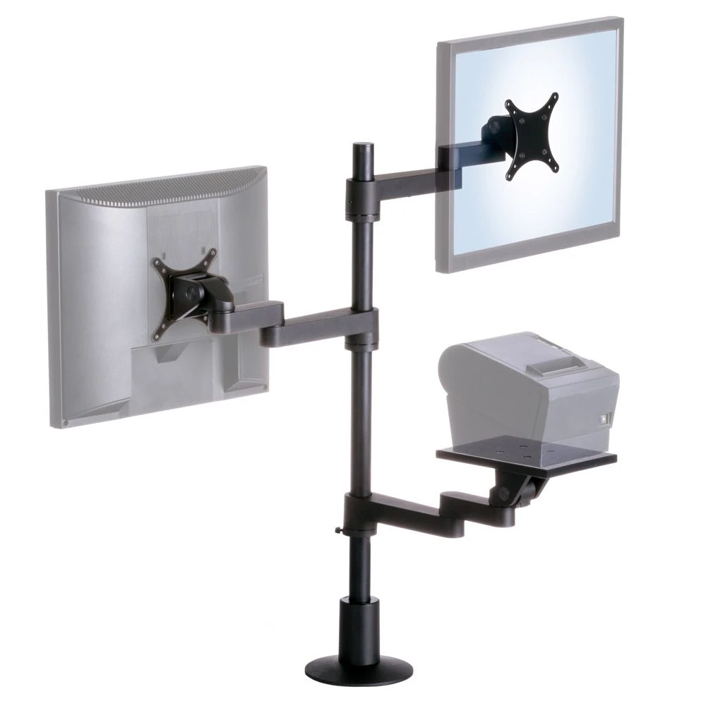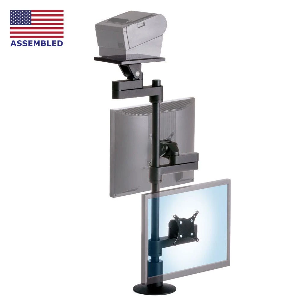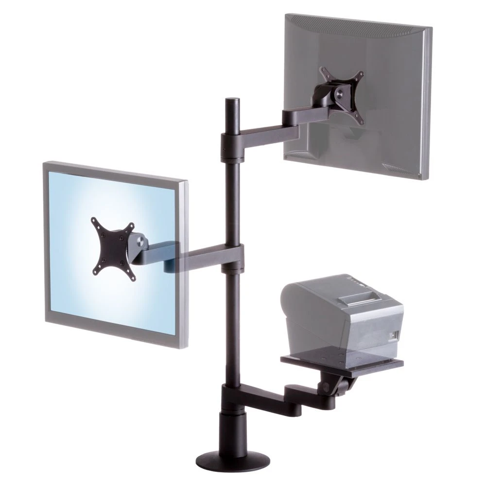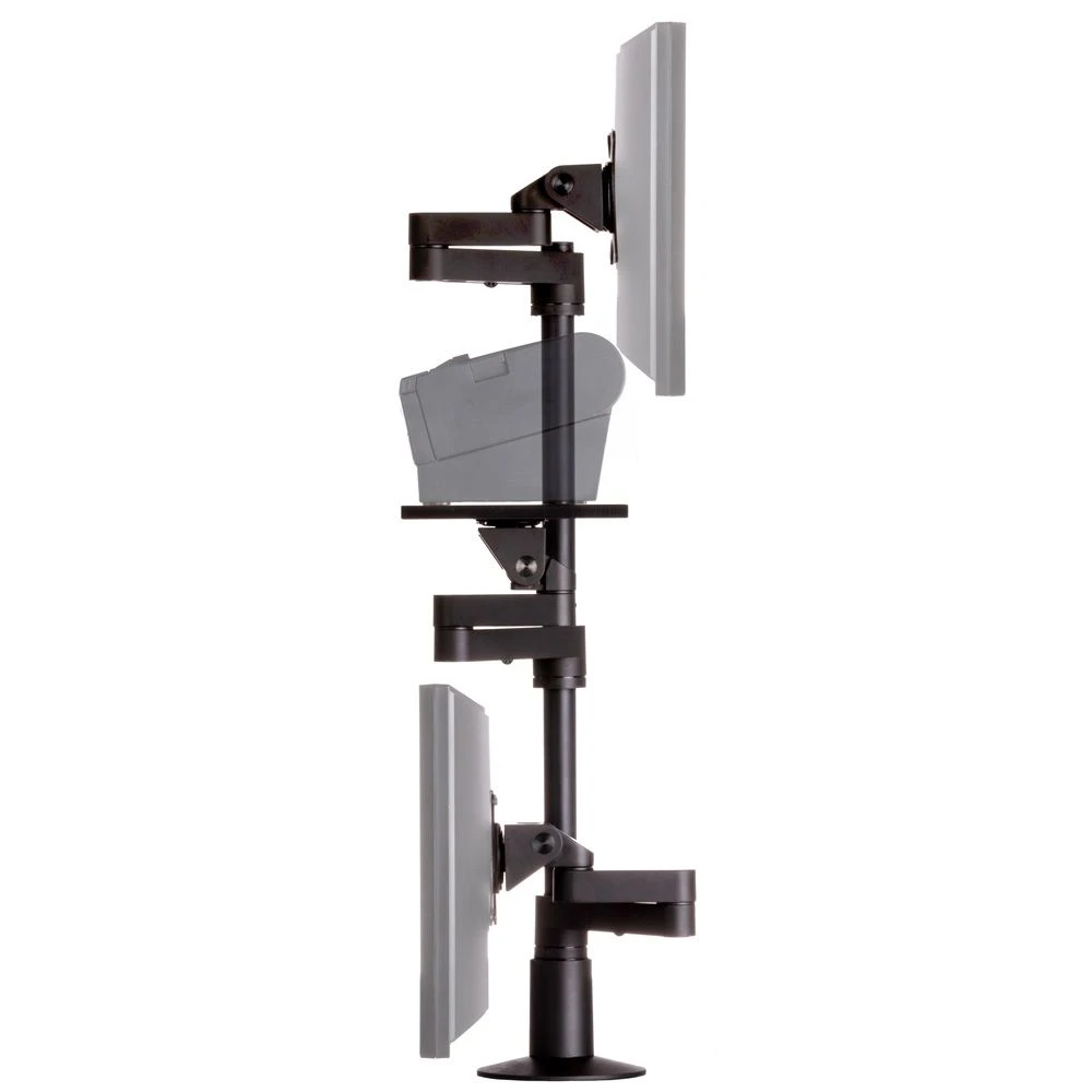 The POS9137T comes with a 28 inch pole and three articulating arms. In its standard configuration, two highly adjustable arms handle touch screens or LCD monitors and allow for easy tilting and swiveling. The third articulating arm is designed to hold a credit card terminal, point of sale printer, or other POS equipment requiring a platform. It includes a a 8.75″ x 6.75″ platform capable of holding one or multiple items depending on the size ordered. Custom sizes may be available depending on the application. Each arm has a 35 pound payload capacity.