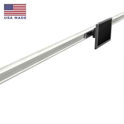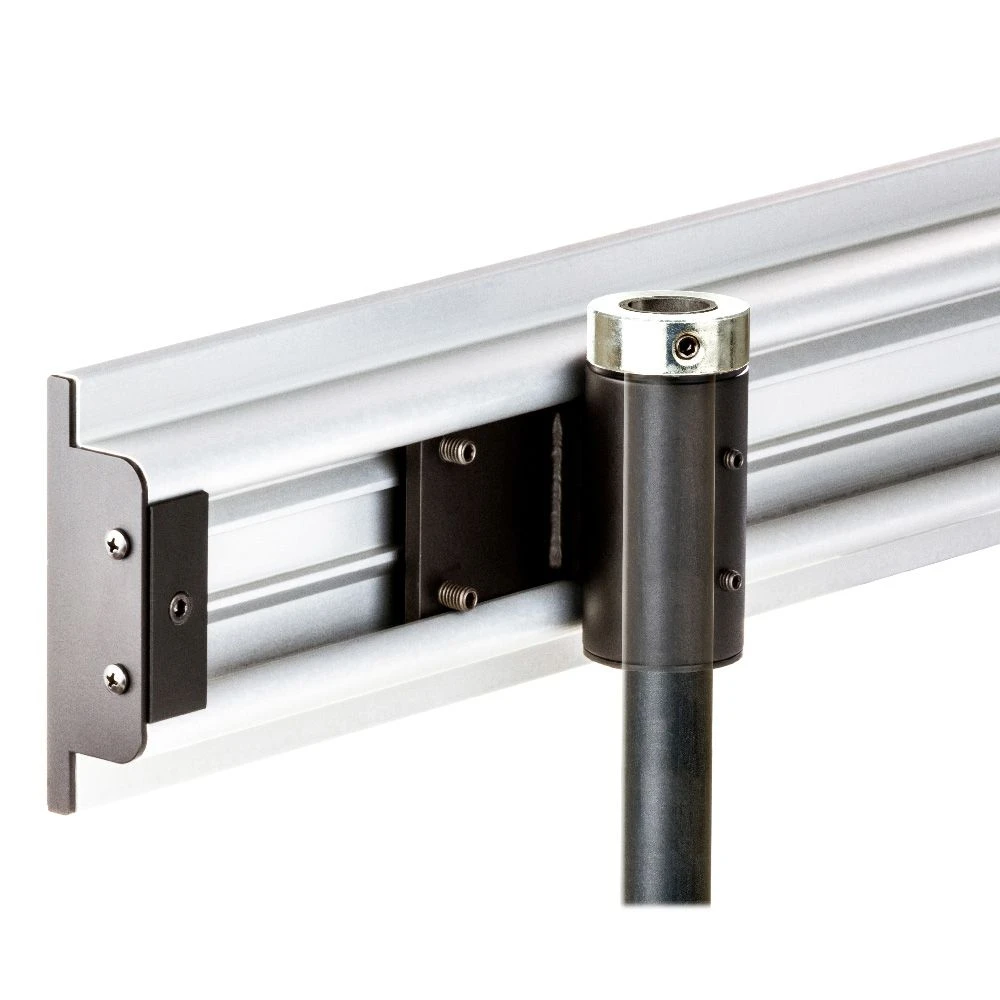 The US made aluminum anodized RT Rail is the foundation of the Roller Track system. It can be mounted on the wall, vertical struts, or poles and accepts movable or stationary mounts that support the desired equipment. Each rail includes 2 end caps and 2 stops. The rail is not pre-drilled for fasteners and is designed to be drilled to accommodate on-site installation. It is available in three standard lengths of 39″, 78″, and 156″ and comes in anodized metallic gray as a standard color with anodized black available as an option. It can be cut down after purchase to shorter lengths during installation. Since the ends are drilled and tapped, an end that is shortened on-site will require re-tapping or modification to ensure the end stop functions properly. Fasteners are always attached on the outside flanges.