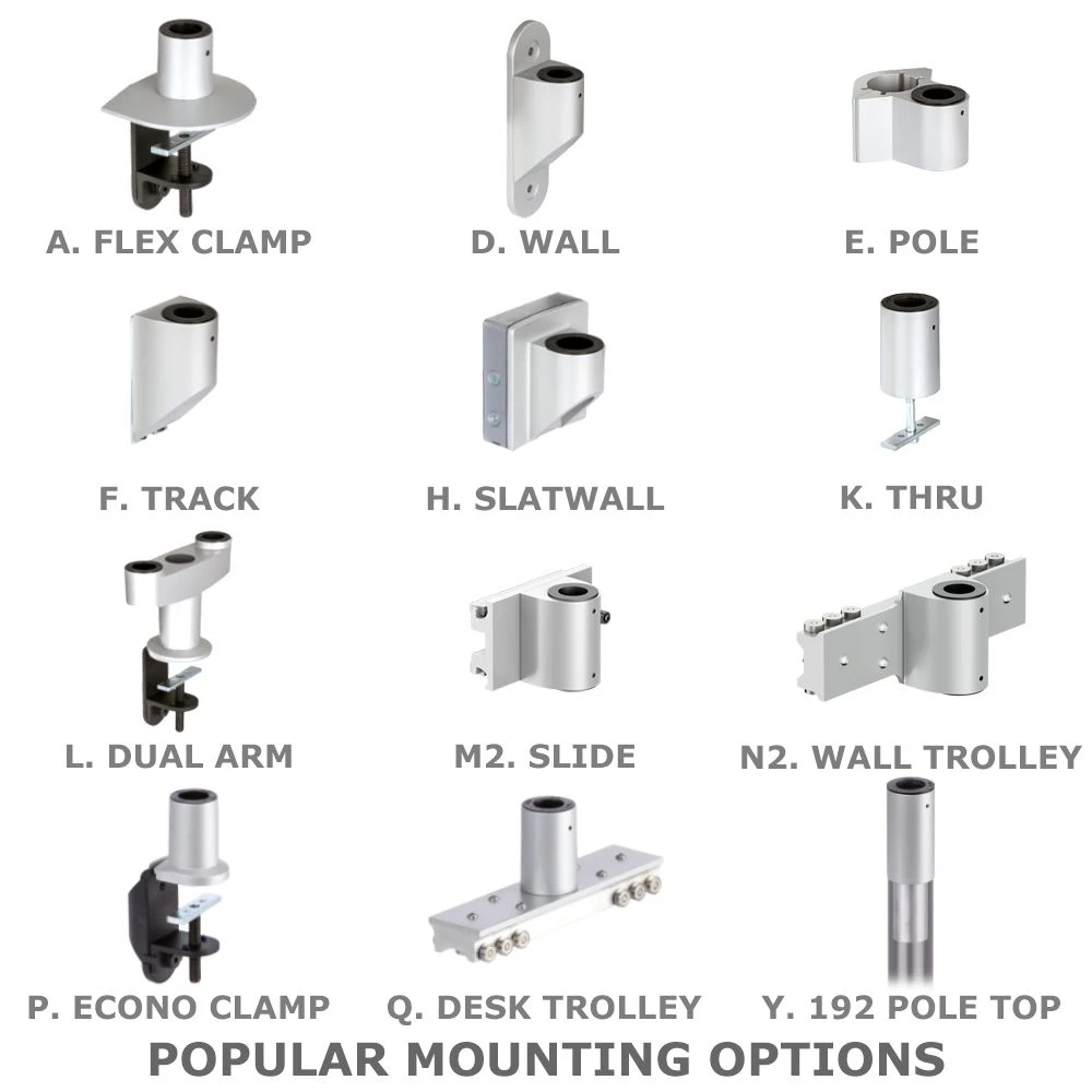 Our high-performance VESA-compliant LCD Arm handles your LCD monitors and touch screen monitors with ease. It is finely engineered and constructed from diecast and finely machined powder coated aluminum components. Assemble it in mere minutes and then never twist a knob or push a lever; this LCD Monitor Arm simply floats your LCD monitor from one position to another without effort. Move the flat screen virtually anywhere in an area 16″ high x 20″ deep x 38″ wide. Customers planning to use this arm in conjunction with lateral extensions should select the “No Mount Kit” option on this page and purchase the Flexible Mounting Kit C separately.Â