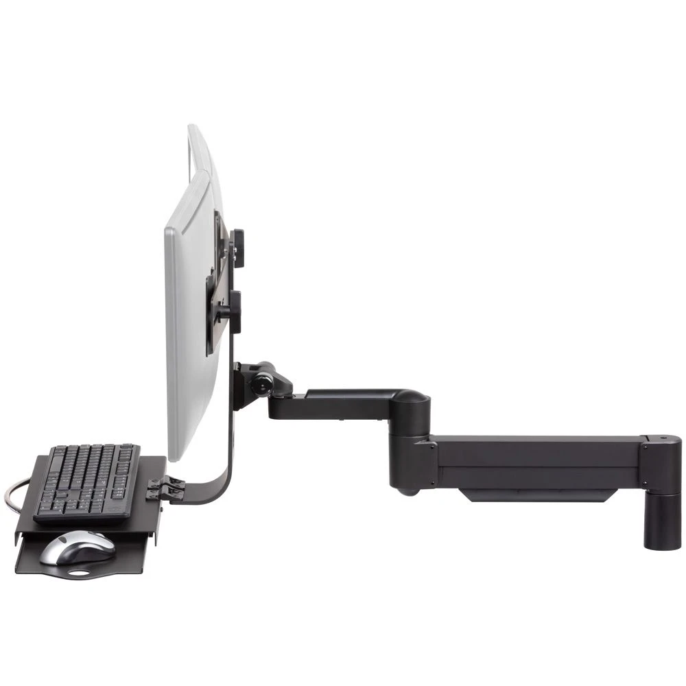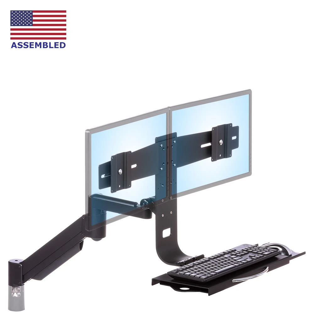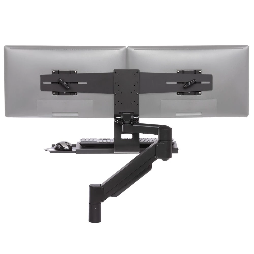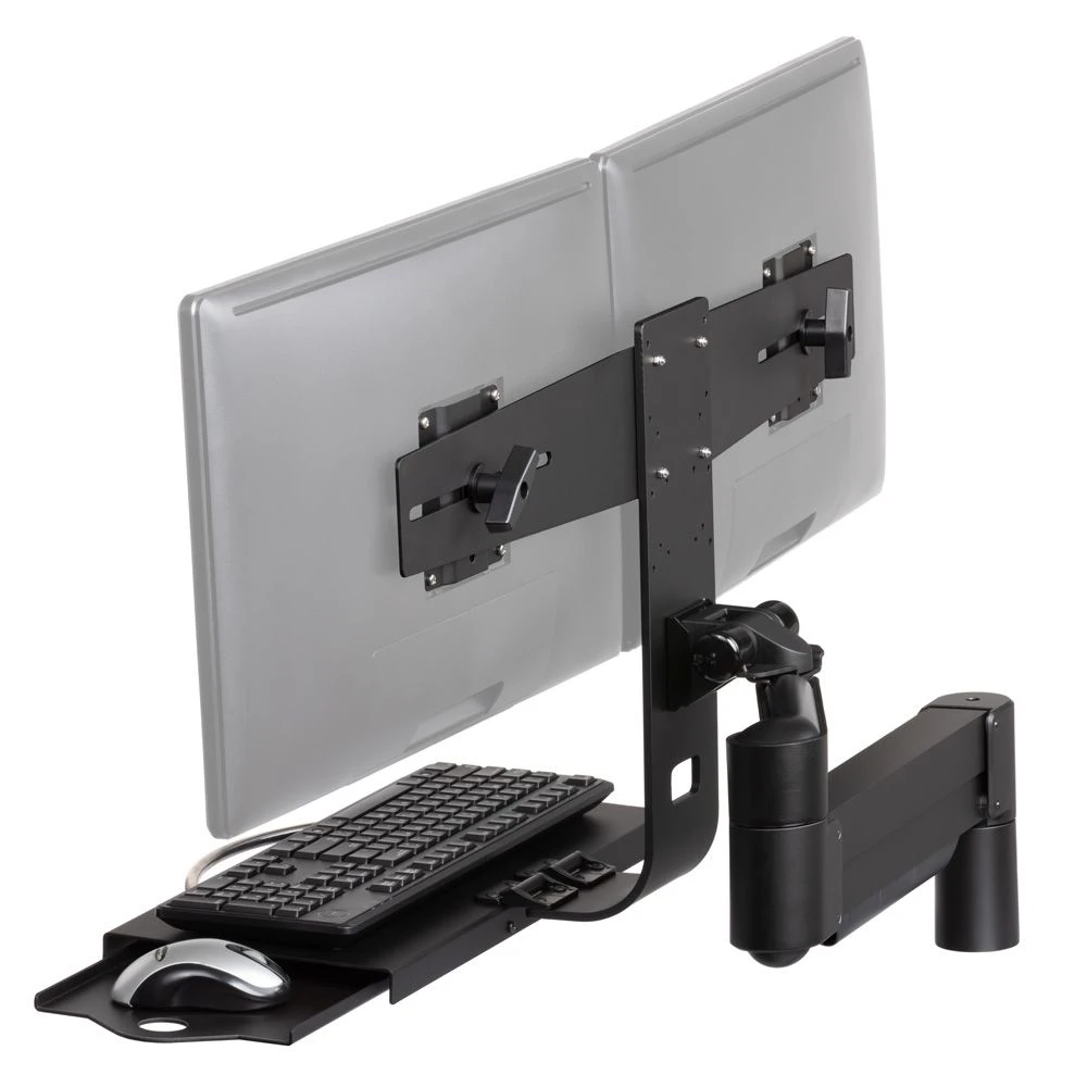 With its substantial range of vertical motion of 18 inches and generous tilt, this keyboard tray and arm combo is ideal for many work environments. The TRP2718D frees up workspace and offers sit-to-stand adjustability. It accommodates two displays up to 8 pounds each. Both the arm and the tray can rotate 360 degrees and the monitors and tray can be tilted at different angles. Great wire management allows for cabling to be routed conveniently through the arm just above the mount. The arm can reach out up to over 26 inches but folds away to a mere 8.5 inches from the wall when not in use. The brake and vertical travel limiter option allows for securing of the vertical position and limits on reach so as to not interfere with other workspace equipment.