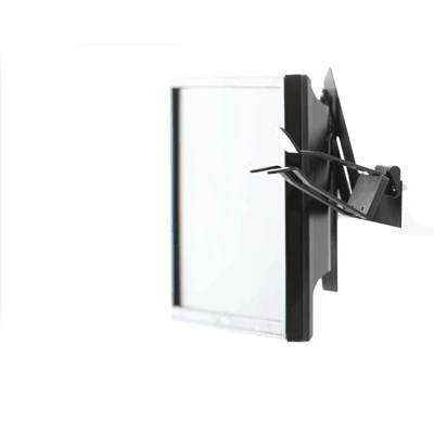 The underlying accessory bracket provides a great deal of vertical and horizontal adjustability which allows the installer to position the scanner precisely at the edge of a monitor, tablet or other equipment. The bracket/cradle may be positioned to the left or right side of a monitor and at the desired height. The optional hinge allows the scanner cradle to be tilted to a convenient angle for maximum ergonomic comfort.